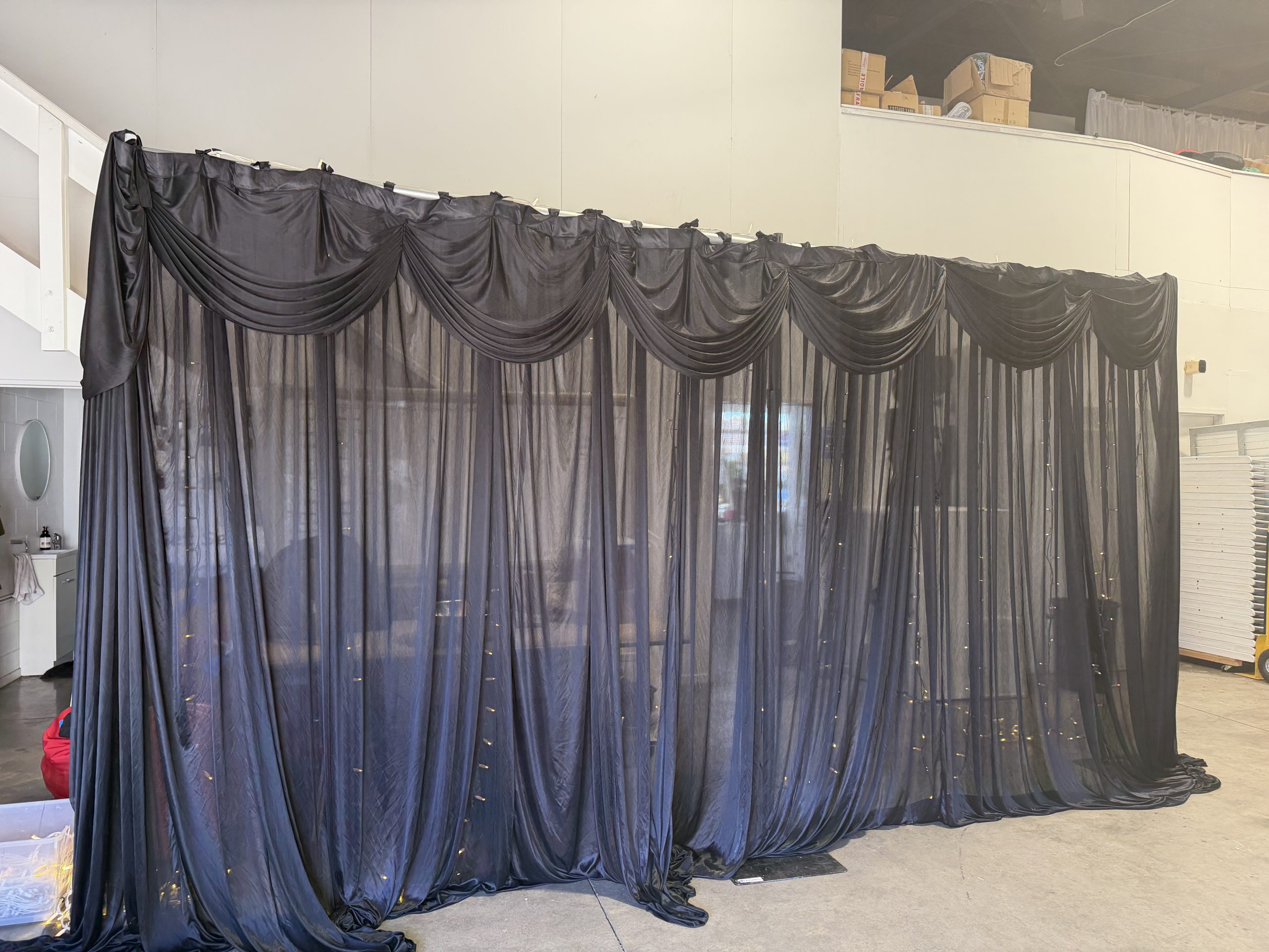 Luxurious black silk scalloped backdrop, creating a soft and elegant statement for any event.