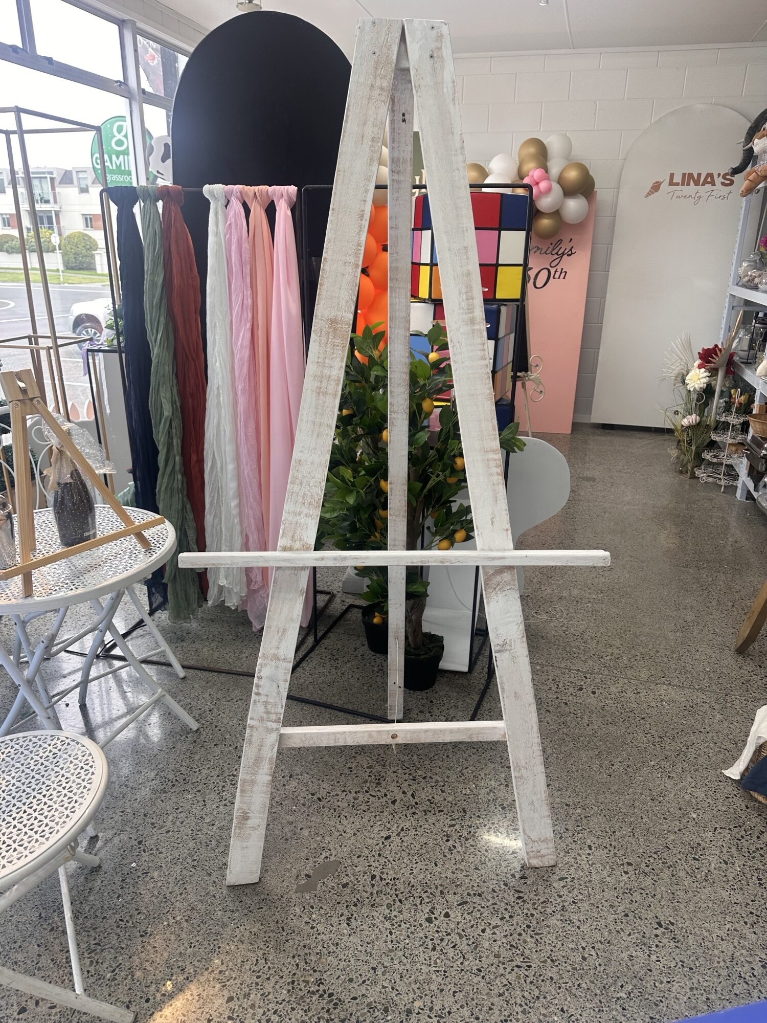 Charming white rustic easel, perfect for displaying welcome signs, seating charts, or event signage. Its lightly weathered finish adds a touch of vintage character while keeping a clean, elegant look suitable for weddings, parties, or corporate events. Sturdy and stylish — a versatile addition to any event setting. 1780 high we have two available.